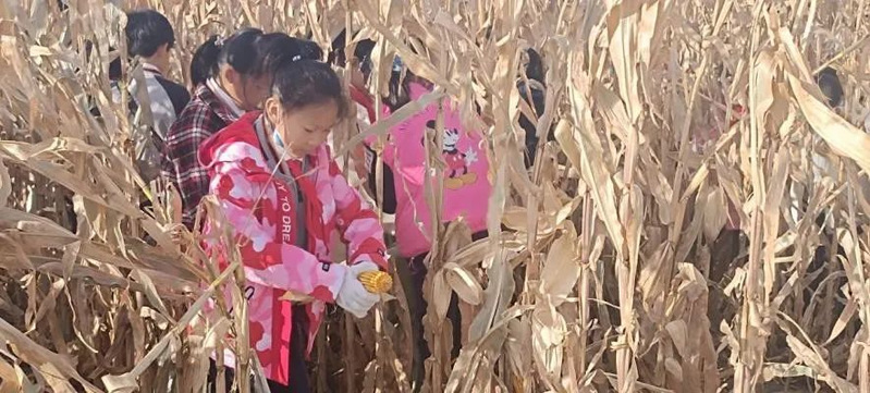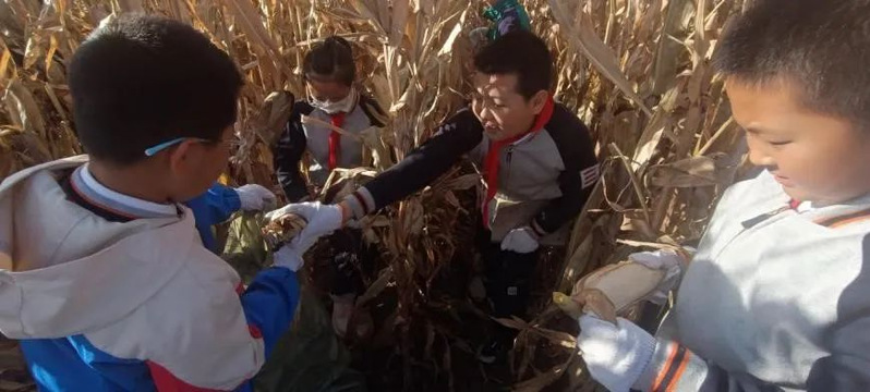 在园区玉米地里,赵良琦老师向同学们介绍了玉米的生长习性和实用价值,并示范给员工如何掰玉米。同学们按照示范,有模有样的劳动起来,员工们分组合作,有序地穿梭在玉米地里,你争我赶,热火朝天,忙的不亦乐乎,不一会儿,一穗穗玉米就堆成了“金山”。