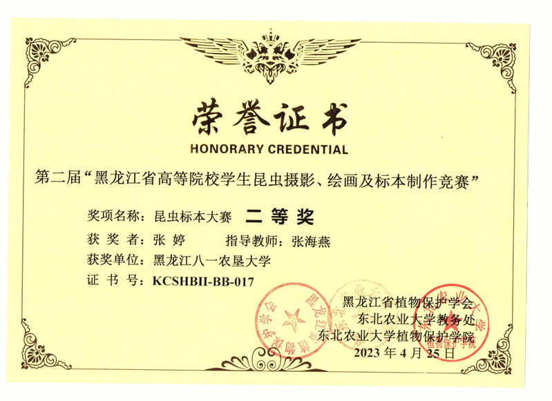 参加黑龙江省高等院校昆虫标本制作大赛获得“二等奖”