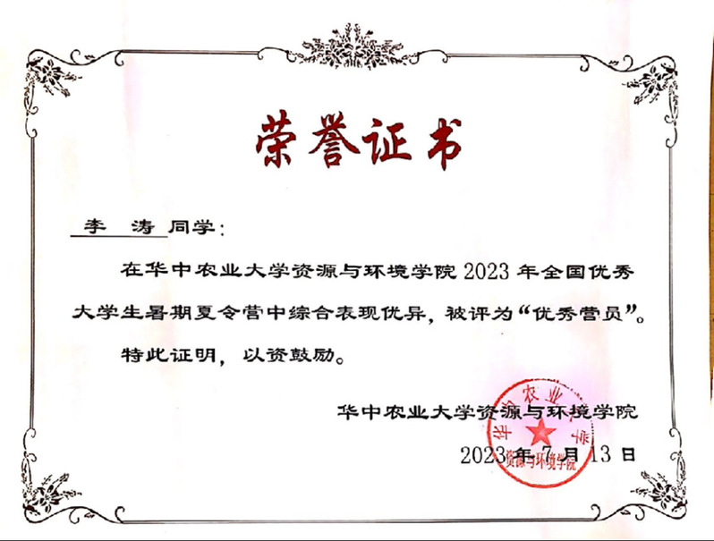 保研事迹:暑期参加华中农业大学、南京农业大学、北京林业大学、华南农业大学夏令营活动并获得优秀营员,预推免阶段参加华中农业大学和南京农业大学面试,最终选择华中农业大学。