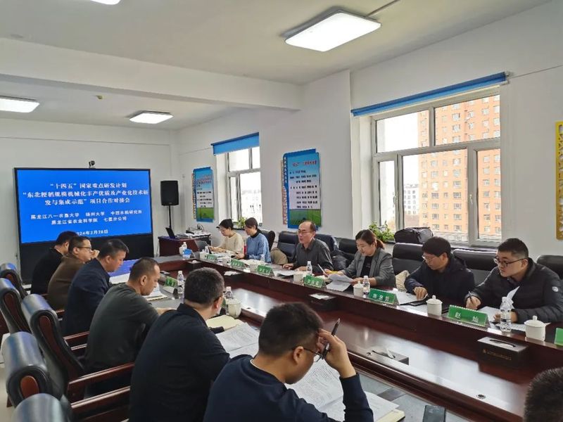 2024年 2月28日上午,必赢线路检测中心、中国水稻研究所、扬州大学、黑龙江省农业科学院在北大荒集团七星农场有限公司召开由公司承担的国家重点研发计划项目课题1“三江平原粳稻温光高效与抗寒促早机械化丰产优质技术研发与示范” 项目合作对接会暨实施方案论证会,课题1各任务负责人及七星农场有限公司相关人员参会。