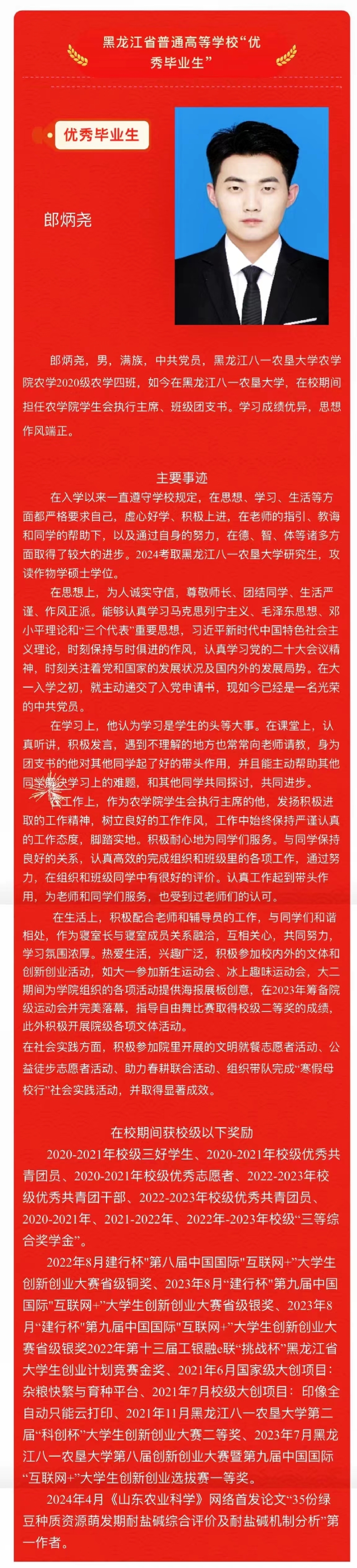 耕读榜样丨黑龙江省普通高等学校“优秀毕业生”郎炳尧