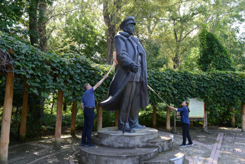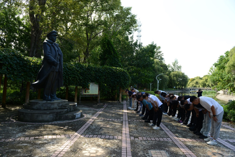 服务团来到清河岸边,清扫王震将军像,大家手持工具,细心擦拭,将军的英容也更加鲜明,对先辈的深切敬意与缅怀之情溢于言表。