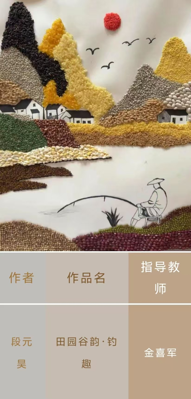 这幅参赛的五谷杂粮种子贴画,创作灵感源于对传统田园生活的向往与对日常生活的热爱。通过常见的五谷种子,构建出一幅充满诗意的田园图景,展现自然之美与生活之逸。 画面中,夕阳西下,橙黄的落日悬于天际,洒下柔和的光辉。几只飞乌在天空中自在 翱翔,为画面增添了灵动之感。远处连绵的山峦,由不同颜色的谷物种子拼贴而成,层次 丰富,色彩自然过渡,呈现出远近高低各不同的视觉效果。山脚下坐落着几座古朴的房屋,黑瓦白墙,宁静祥和,仿佛诉说着岁月的静好。近处的河畔,一位老者头戴斗笠,悠然地坐在小板凳上垂钓。他神态专注,身旁的绿植生机勃勃。河水虽只用简单的线条勾勒,但也衬托出静谧的氛围。 整幅作品运用了多种五谷杂粮种子,如黑豆、红豆、黑米、小米等,利用它们天然的 色彩和形状,通过精心布局与粘贴,构成了这幅富有韵味的田园垂钓图。希望传递出一种 远离喧嚣、回归自然的生活态度,唤起人们对田园生活的美好憧憬,是传统手工艺与艺术创作完美结合的作品。