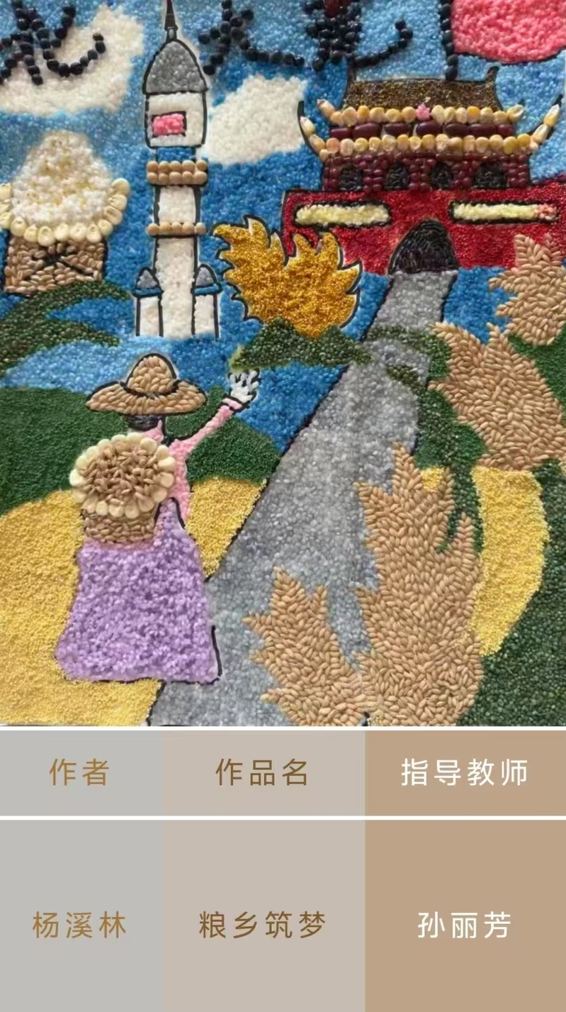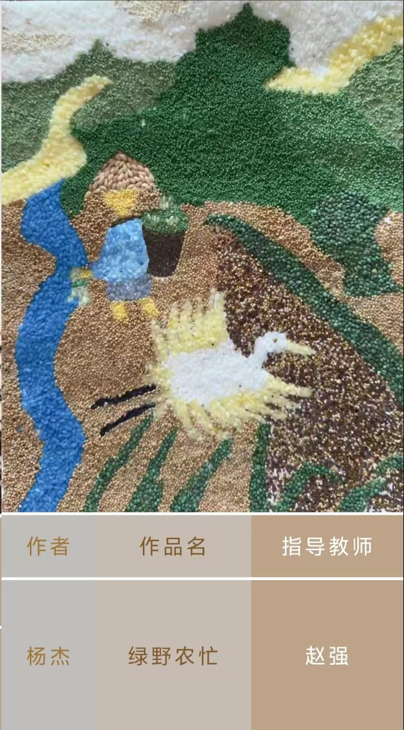 创作背景:“艰苦奋斗、勇于开拓、顾全大局、无私奉献”的北大荒精神,承载着几代拓荒人战天斗地的热血史诗。 从荒原到粮仓,北大荒的蜕变是无数人用青春与汗水浇灌的成果.创作者以种子画为载体,借“粮乡筑 梦”主题,致敬北大荒精神,展现其在新时代对乡村发展、粮食生产的精神引领,让观者透过五谷杂粮的拼贴,重温垦荒岁月,感悟传承力量。内容呈现:画面以各类种子为“颜料”,勾勒北大荒粮乡图景,蜿蜒小路串联起标志性建筑,象征垦荒者开辟的奋斗 之路,延伸向希望远方;金黄麦穗、饱满稻粒铺就田野,是北大荒“年产粮超400亿斤”奇迹的缩影,彰 显粮食生产根基;戴斗笠的人物背着粮筐,传递出北大荒人“艰苦奋斗、勇于开拓”的实干姿态,呼应垦 荒时“啃冰冻馍、人力拉犁”的拼搏;天空、云朵、山峦用多彩种子点缀,寓意北大荒在守护生态中发展,如“三减行动”护黑土,让粮乡既有丰收盛景,又具可持续未来,生动诠释北大荒精神在粮乡筑梦、赋能乡村振兴的时代内涵。