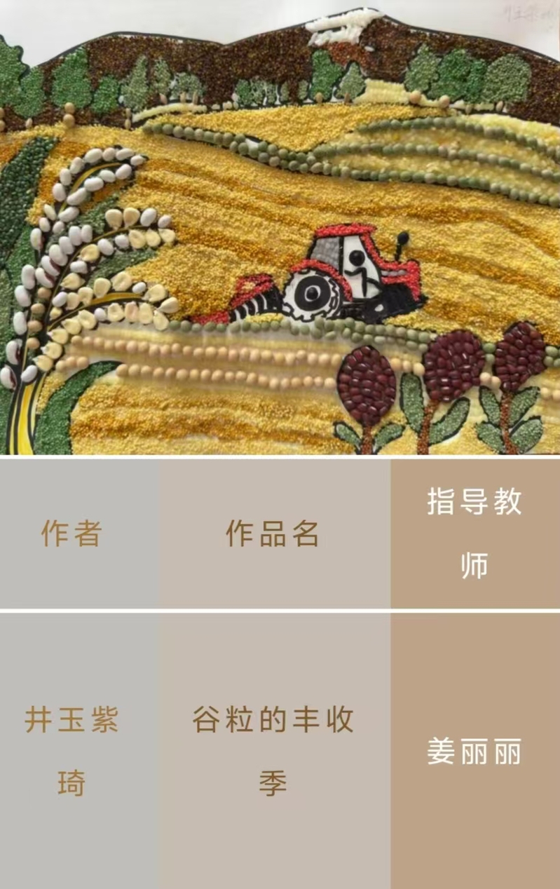 这幅作品是极具巧思的五谷杂粮粘贴画,以粮食为独特画笔,勾勒出农田丰收的生动景,尽显艺术与生活融合之美。 创作材料上,丰富多样的五谷杂粮是主角,金黄小米铺成麦浪,饱满色泽瞬间勾勒出 丰收的饱满与热烈;绿豆、红豆化身灵动的绿树与花朵,为画面点缀自然生机;黑白相间 的豆子精准拼贴出农机,让劳作场景鲜活呈现;背景山峦则由不同颜色杂粮混合铺就,借色彩层次营造出深远意境.画面以田野为核心场景,麦浪如波,农机穿梭其中,传递出忙碌又喜悦的劳作氛围。绿树、花朵与山峦环绕,构建出完整乡村田园空间,将田园风光与农耕气息完美融合。艺术价值与内涵上,它不只是手工创作,更是对自然馈赠的深情珍视。用平凡五谷绽 放艺术光彩,每一粒粮食都承载着土地的力量,诉说丰收喜悦,传递对土地的感恩,让观 者在感受艺术巧思时,也唤起对田园、对衣耕文化的关注与热爱,是生活素材升华为艺术表达的生动范例.