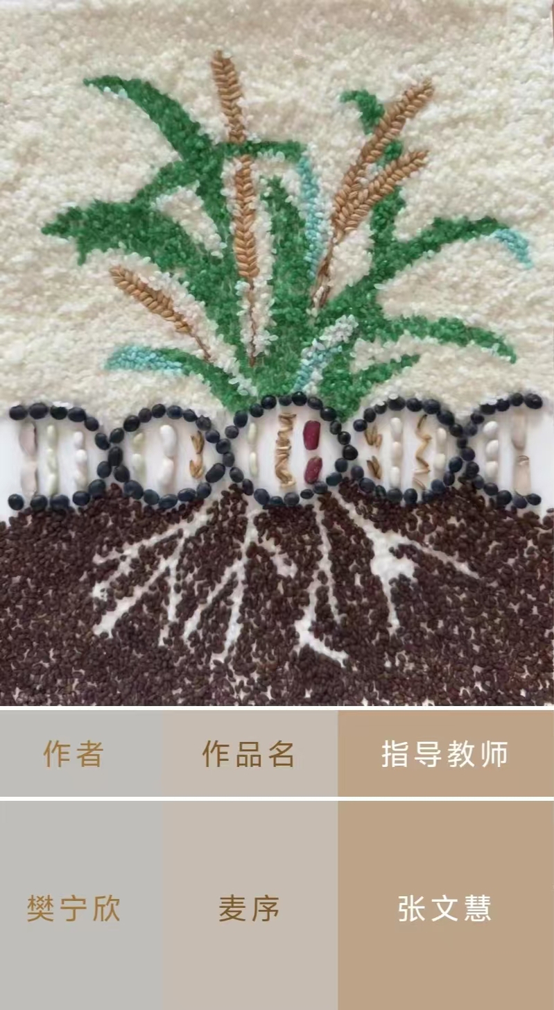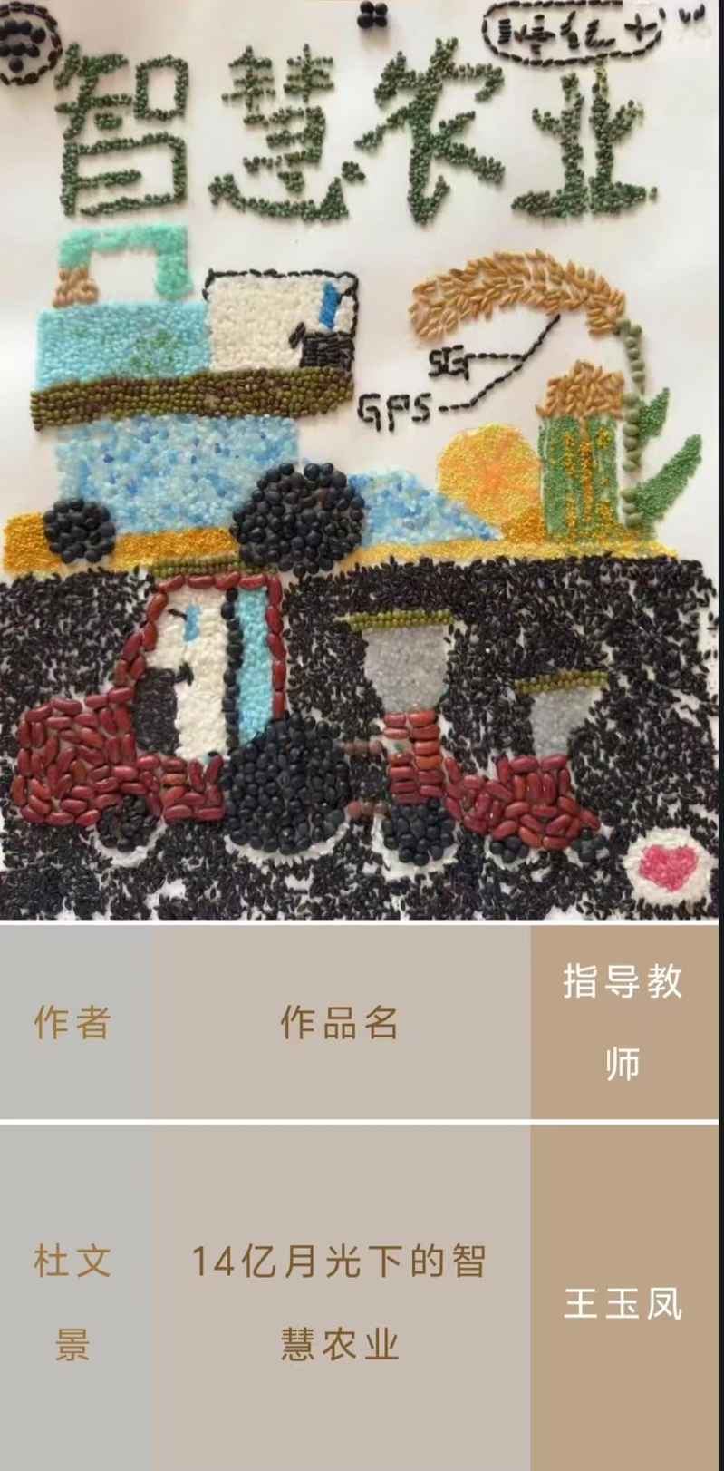 创作背景:基于对农业科技融合趋势的关注。当下,农业现代化进程中,基因技术助 力品种改良、增产提质,AI则为艺术创作与农业科普搭建新桥梁。用日常农作物拼贴,让 抽象的基因科学与熟悉的农业场景结合,以艺术形式传递农业科技内涵,唤起对粮食生产、农业创新的思考,兼具审美与科普价值,展现科技与艺术、农业交融的创意视角。 内容:以大米铺就底色,模拟田野的质朴。上层绿色彩米化作麦苗叶片,呈现蓬勃生 机;麦穗用棕米色谷物粘贴,体现作物成熟。中层以稻穗、豆粒等拼出DNA双螺旋结构, 将农业与生命科学关联。下方用褐色米粒拼出类似土地纹理,展现土壤生态。整幅画通过 大米、彩米、豆类等粮食材料,把农作物从地上植株到地下“基因根基”完整呈现,传递 对自然农耕、粮食本源的敬意,寓意农业发展既依托自然生长规律,也可借基因科技探索创新,是自然与科技结合表达。