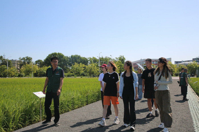 带着这份滚烫的感动,队员们踏着晨露走进水稻试验田。和煦的微风掠过万亩沃野,在连片的稻浪间掀起层层金波,稻穗饱满的颗粒碰撞出细碎的声响,像是大地在轻声吟唱。“全国五一劳动奖章”获得者刘士昌的身影早已出现在田埂上,他裤脚沾着泥土,手里攥着沉甸甸的稻穗,向围拢过来的学子们细数 “天盈 6739”等新品种的特性:“你看这穗型,紧凑抗倒伏;再瞧这米质,晶莹有嚼劲,亩产比老品种提高了三百斤。”