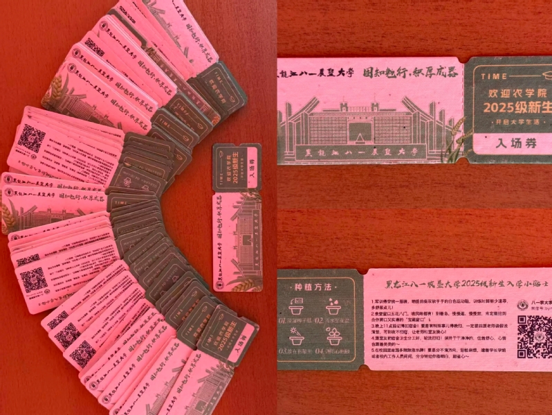 2025 级新生“农大入场券种子卡”以清新绿为主色调,正面印 “必赢线路检测中心 2025 级新生” 字样与校园建筑,仪式感十足;背面有报到流程等入学小贴士,扫码可关注学院公众号。