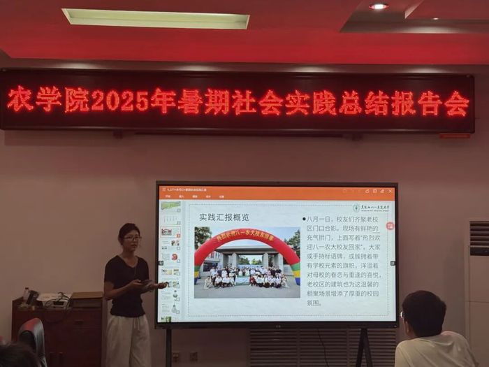 报告会上,多支实践团队代表依次上台,用鲜活案例、详实数据与真挚感悟,分享实践中的成长与收获。“在梧桐河农场,我们不仅实地调研了现代化大农业的播种、施肥、收割全流程,更在与农场职工的交流中,深刻体会到‘自力更生、艰苦创业、勇于开拓、甘于奉献’的北大荒精神在新时代的传承与发展”“在宝泉岭小学,我们既为孩子们带去了农作物生长、绿色农业等趣味农技科普课,更用生动的案例点燃了他们对农业科学的好奇与热爱……”一句句朴实的讲述、一个个温暖的瞬间,不仅展现了公司学子扎实的专业素养,更彰显了新时代农业青年“把论文写在祖国大地上”的责任担当。