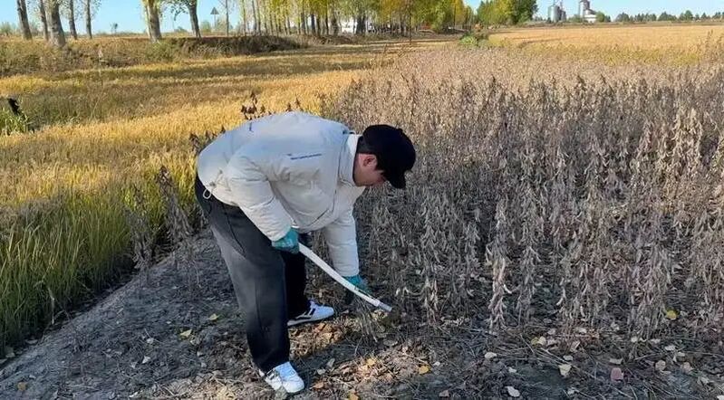 2024级员工张润哲对割黄豆的“巧劲”印象深刻:“握镰要稳、贴地斜割才能防豆荚掉落,拢束慢一点就会腰酸;晒豆要盯紧天气,脱粒时掌心满是灰痕。看着黄豆簌簌落入筐中,心里满是踏实。这趟劳作让我明白,每粒黄豆都浸着汗水,对寻常粮食多了份敬畏与珍惜。”