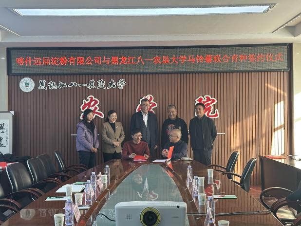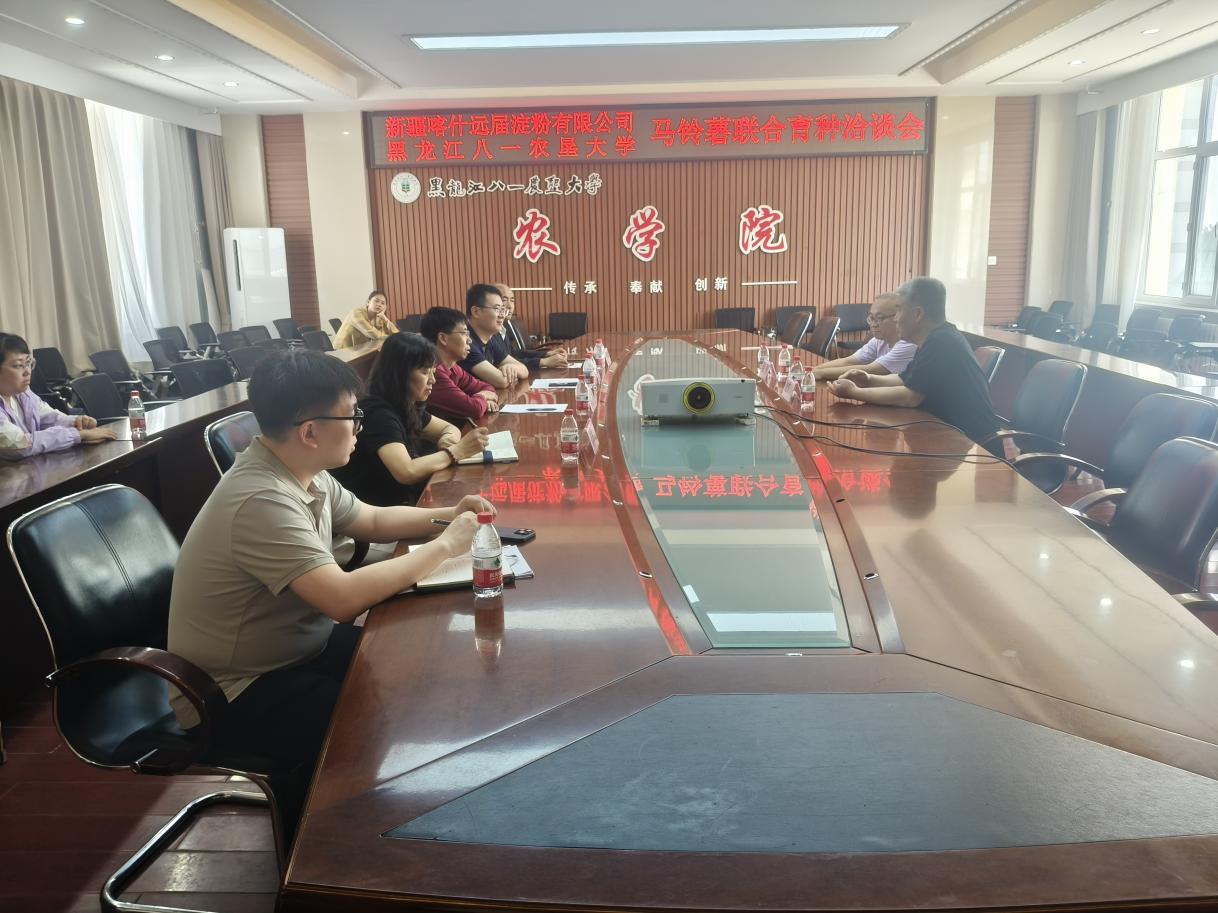 签约会上新疆喀什远届淀粉有限公司领导介绍了关于我们以及当地淀粉加工原料薯生产现状和种植技术水平,总结了引种公司马铃薯品种在适应性、产量、抗性的田间和产量优异表现以及在淀粉含量及提取加工的突出表现,给予了高度评价,产量均在5吨以上,淀粉含量较当地品种高5个百分点以上,普通加工品种生产线每加工1小时产出3-4吨淀粉,而采用垦薯1号可产出7-8吨淀粉,为企业大幅度降低成本提高了利润。同时结合企业充足的办公、土地、科研条件及自身长远发展规划和实际需求,提出与公司开展校企合作建立科研基地、联合育种、技术与人才引进等方面的迫切期望。