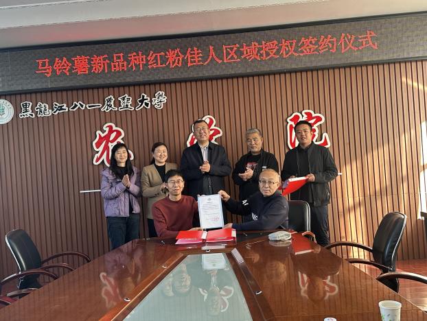 马铃薯种质资源创新与新品种选育团队负责人金光辉与新疆喀什远届淀粉有限公司双方签订了“红粉佳人”区域授权及联合育种开发合作协议,为今后双方开展更深度合作如新疆育种基地建设、员工培养、就业等方面奠定坚实基础和保障。同时陪同新疆喀什远届淀粉有限公司领导参观了团队实验室和马铃薯淀粉的简易提取工艺。