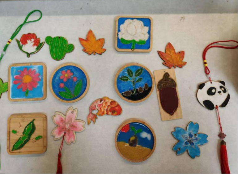 非遗传承贵在守正创新。两只团队不仅推出多款文创产品,更打造沉浸式体验课程,让参与者在激光雕刻的底板上亲手进行掐丝、点蓝创作。这种“科技+手工+自然”的美育模式,成功将员工从非遗的旁观者转变为参与者。“粉红樱花”挂饰以金丝勾勒优雅花型,蓝底白瓣尽显高洁;“春芽初起”杯垫将破土而出的生命力定格方寸;“鲤跃龙门”锦鲤挂饰鳞片细腻,栩栩如生。这些作品巧妙融合激光的精准与手工的温度,展现传统工艺与自然美学的双重魅力。参与同学表示:“这次活动不仅让我亲手体验了非遗技艺,更感受到传统工艺与现代科技融合的魅力。”