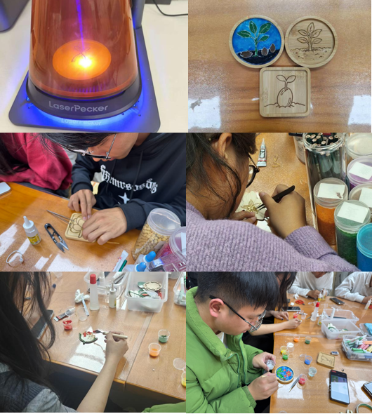 活动伊始,“巧思”珐琅工作室成员为同学们系统讲解了掐丝珐琅的历史渊源与工艺特色。作为国家级非物质文化遗产,掐丝珐琅以金丝勾勒轮廓,再以釉料填充成画。工艺流程主要包括绘图、掐丝、填色、固化等步骤。种艺美育社团利用科技赋能,将掐丝珐琅其金丝勾勒、釉料填色的独特工艺,通过数字建模与激光雕刻技术将荷花、樱花等植物形态及熊猫等元素得以精准呈现于竹木板材,解决了传统手工描图精度不足的难题,为后续掐丝奠定完美基础。