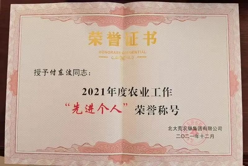 每一份荣誉,都是深耕不辍的见证;每一项奖项,皆为实干笃行的注脚。付东波的二十三年农业路,镌刻着对黑土地的无限赤诚:2013年获评黑龙江省粮食生产先进科技工作者,以科技助力粮食增产;2016年荣获国家农业技术推广贡献奖及全国农牧渔业丰收贡献奖,以专业诠释推广价值;2021年被评为北大荒集团农业工作先进个人,以担当扛起农业发展重任。这些沉甸甸的荣誉,不仅是对他扎根农业科研、助力农民增收的肯定,更是对他践行“把论文写在黑土地上”誓言的高度褒奖,彰显了新时代农业工作者求真务实、躬耕一线的精神底色。